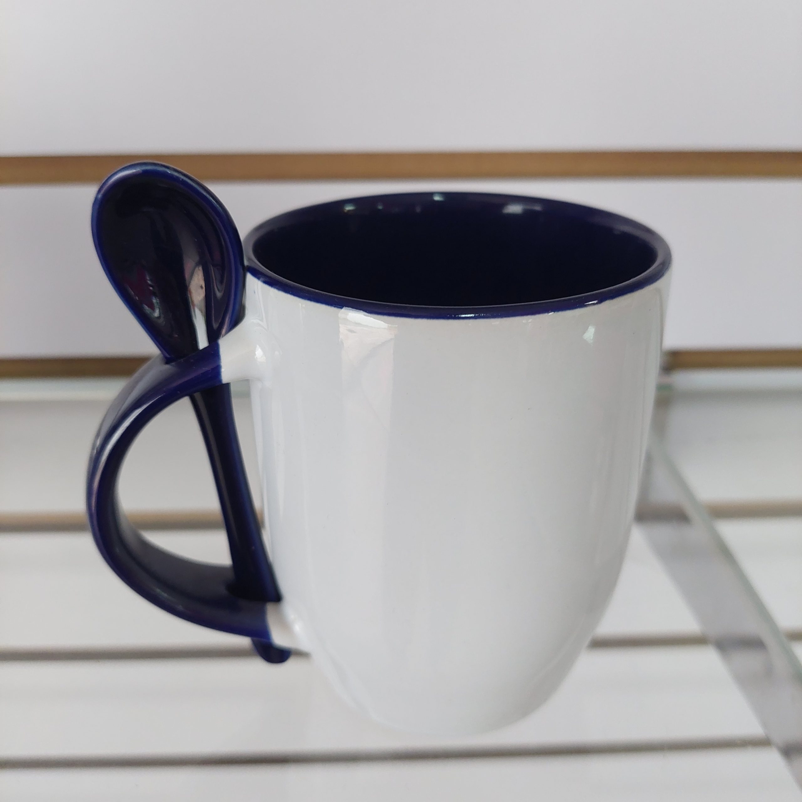 Taza de cerámica de 11 oz en azul con interior blanco, acompañada de una cuchara a juego.